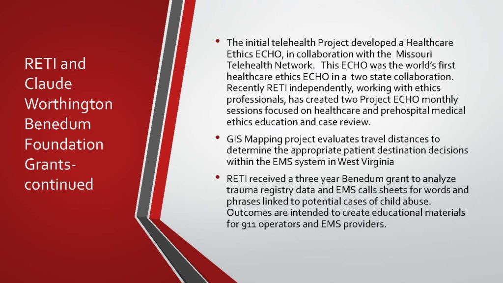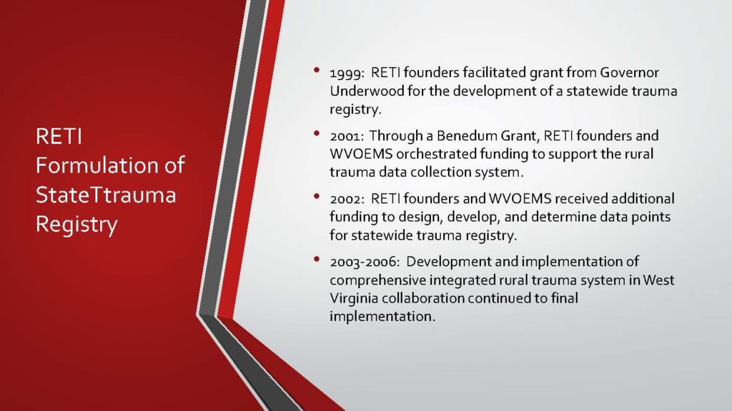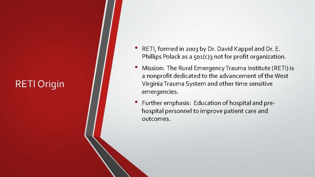The origins of The Rural Emergency Trauma Institute (RETI), a non-profit organization, began in 2003. Dr. David A. Kappel and Dr. E. Phillips Polack formed RETI, with its mission to support and improve West Virginia’s Rural Trauma System through research, data, and analysis. These physicians have accomplished many things over the last several years while following their personal passions and RETI’s mission. Through generous funding, RETI has achieved many things: