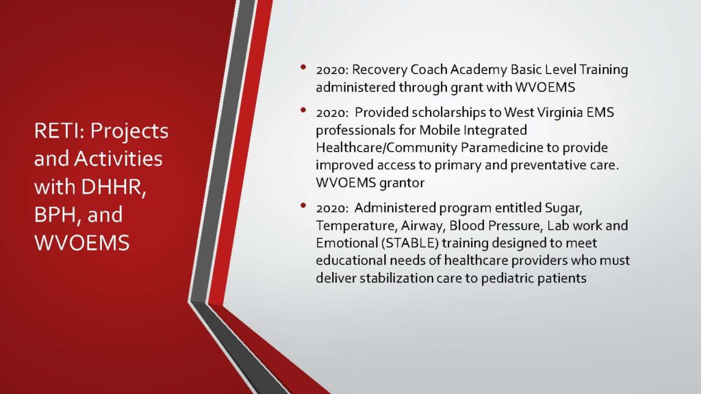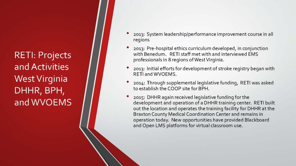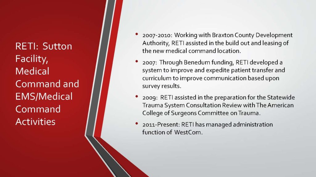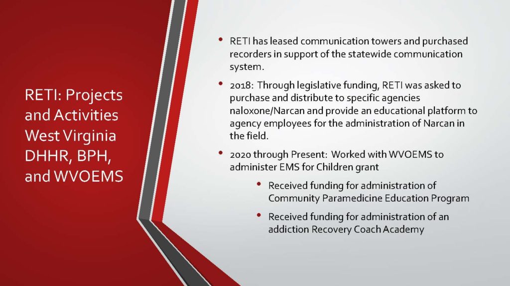 - RETI has facilitated construction of tower sites to improve the medical command network in West Virginia.